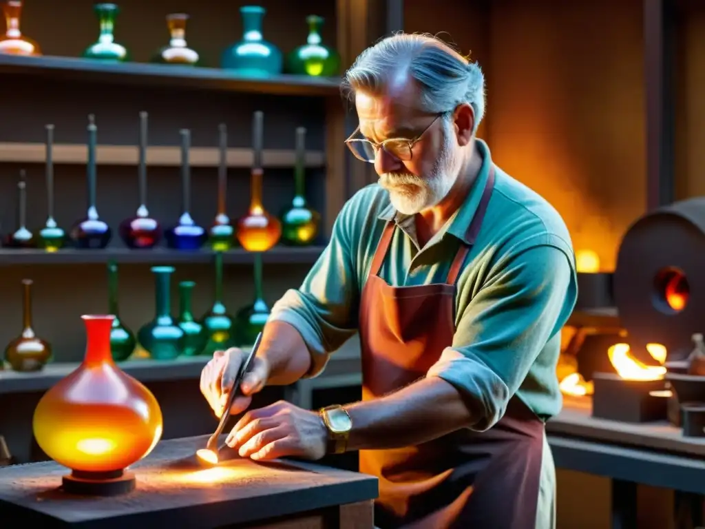Un hábil artesano moldea vidrio en un taller vintage iluminado por la luz solar